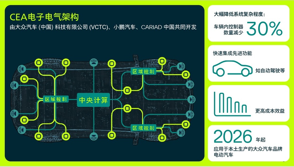 CEA的研发团队由来自小鹏汽车、大众汽车(中国)科技有限公司和CARIAD中国的技术专家组成。联合团队将强化以软件为导向的开发方式,推动包括自动驾驶和下一代智能网联功能在内的先进技术研发,构建一个基于区域控制及准中央计算的电子电气架构——包括区域控制器、中央计算平台、云平台和后台互联等功能,并快速、经济地将其集成到大众汽车品牌的车辆中。