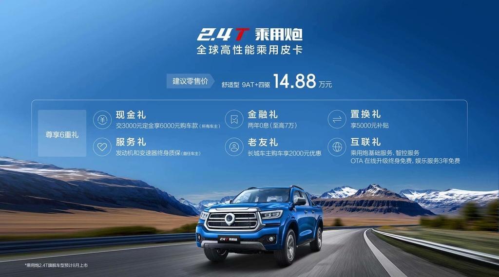2.4T乘用炮定位“全球高性能乘用皮卡”,基于坦克平台,以乘用车标准打造,够劲、够省、够可靠,助力每一位热爱生活的人,自由追寻心中的诗与远方。此外,长城炮还为购车用户推出“现金礼、金融礼、置换礼、服务礼、老友礼、互联礼”六重购车大礼,价值拉满,诚意满满。