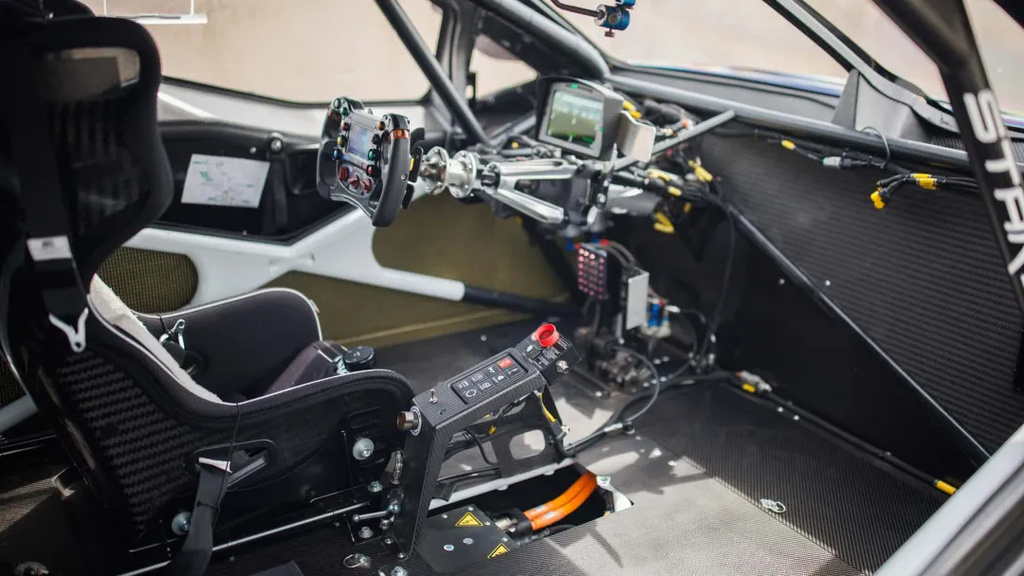 超级皮卡的座驾内部非常简洁,有裸露的碳纤维地板、赛车座椅、方向盘、小显示屏,其他什么都没有。一个临时的中控台上有两排按钮,可以控制各种车辆功能。