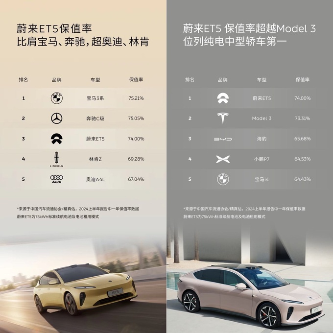 近日,中国汽车流通协会和精真估联合公布了2024上半年二手车保值率榜单。在租电模式下,75kWh标准续航电池的蔚来ES6一年保值率达到74.5%,在2024上半年纯电动中型SUV的榜单中位列第一,超过特斯拉Model Y,在35-50万级热销中型SUV排名中,超过奥迪Q5L和宝马X3;75kWh标准续航电池的蔚来ET5一年保值率达到74%,同样成为纯电动中型轿车保值率冠军,超过特斯拉Model 3,在30-40万级豪华中型车排名中,超过奥迪A4L和林肯Z。