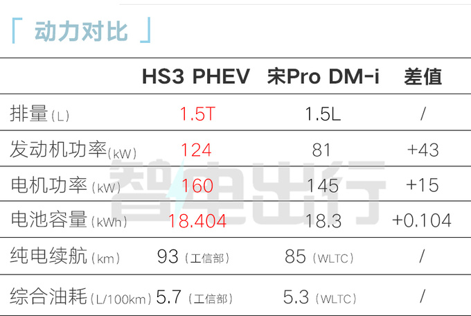 HS3 PHEV发动机最大功率124kW,匹配功率160kW的电机,搭载宁德时代生产的18.404kWh磷酸铁锂电池,配备红旗混动专用变速器,WLTC效率87.6%,纯电续航里程115km。