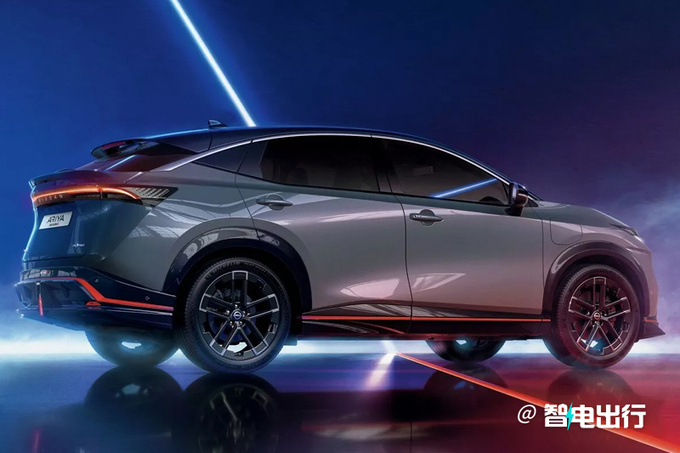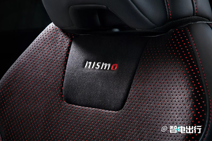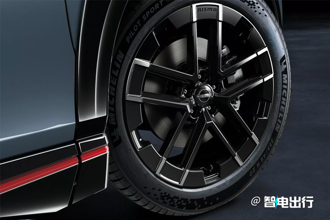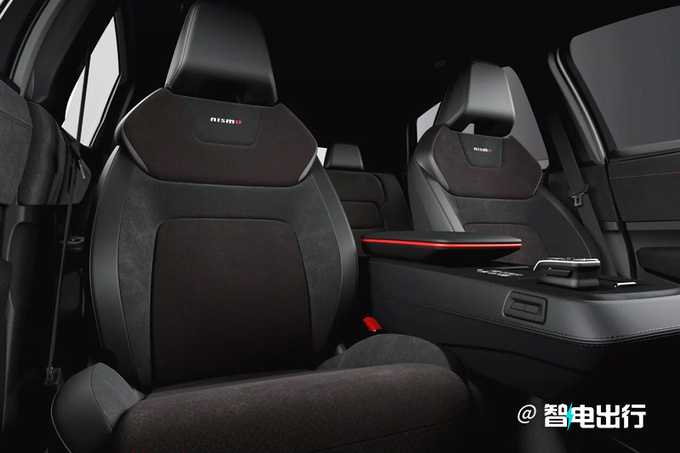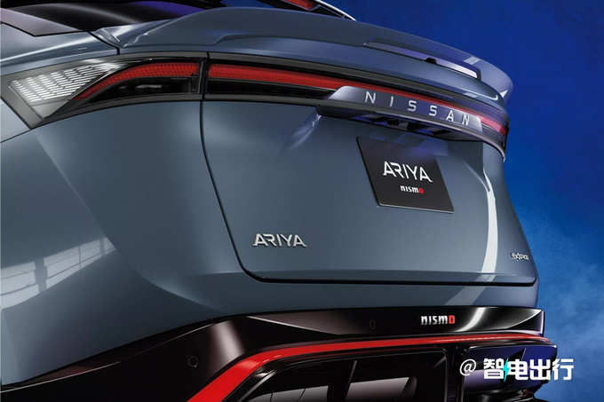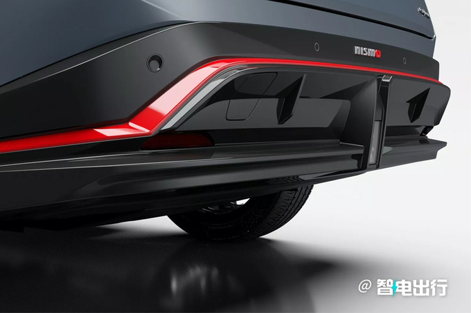 从发布的新车官图中可以看出,Ariya Nismo车型头部装配了熏黑大尺寸封闭式格栅,下方保险杠处加入了带有红色饰条的熏黑运动前铲。车身两侧也同样加入了带有红色的饰条的侧裙套件,尾部则提供了带有Nismo字样的全新造型保险杠以及领航灯,尾门上方还配备了小鸭尾扰流板。