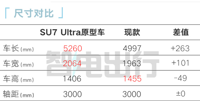 SU7 Ultra原型车包括车门、车顶、前舱盖、尾箱盖等24处更换碳纤维材质,并增加了造型夸张的前唇,前舱盖增加散热集风罩,两侧增加碳纤维侧裙,尾箱上搭载大尺寸固定尾翼,后杠位置配备超大的扩散器。