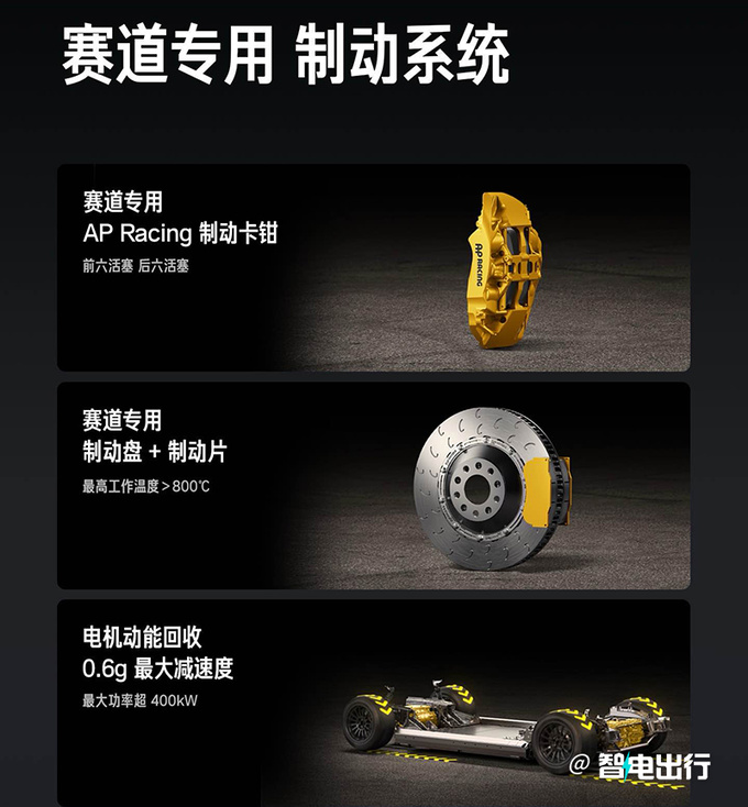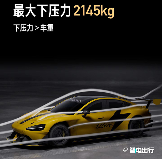 SU7 Ultra原型车减重超500kg,整车质量1900kg,下压力达到2145kg。新车配备宁德时代麒麟II电池组,放电功率达1330kW,峰值电压897V,充电倍率5.2c,使用AP Racing前/后6活塞卡钳,并配备赛道专用制动盘和制动片,电机动能回收最大减速度0.6g,最大功率超400kW,100-0km/h制动距离25m。
