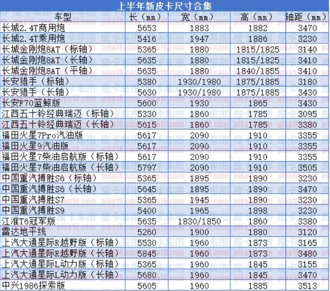 当国内皮卡市场迈向乘用化之后,用户对于皮卡的需求早已不仅是满足商用载货需求,这就对其外观设计提出了更高要求。而对于皮卡来说,高大威猛是大多数用户对于皮卡外观的核心需求,这就要求皮卡在设计研发时具备更强的宽体属性。今年1-7月国内共上市近20款新皮卡,笔者已将其车身尺寸汇总于一表,宽度来看它们大多在1880mm以上,更是有三款车型宽度超过2米。