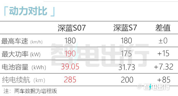 7月25日,深蓝S07上市,售价区间14.99万元-21.29万元。新车提供副驾零重力座椅、14扬声器音响、3C快充电池包等,并可选华为乾崑智驾ADS SE系统。S07增程车型搭载比S7更大的电池组,纯电续航提升至285km,综合续航1200km,电池电量从30%-80%充电时间仅15分钟(S7为30分钟)。
