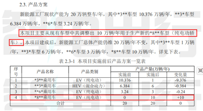 本项目主要从现有车型(bZ3、bZ4X、格瑞维亚)中共调整出10万辆/年用于生产新纯电动轿车,全厂总体产能仍为20万辆/年不变。