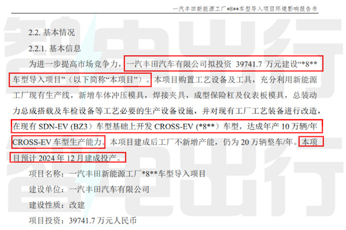 一汽丰田汽车有限公司拟投资39741.7万元建设新车型导入项目,在现有SDN-EV(BZ3)车型基础上开发CROSS-EV车型,达成年产10万辆/年CROSS-EV车型生产能力,预计2024年12月建成投产。