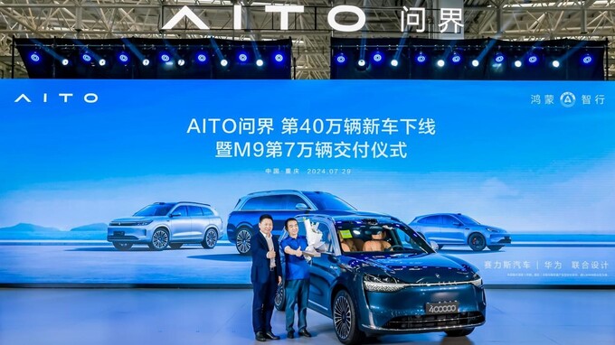 2024年7月29日,AITO问界第40万辆新车下线暨M9第7万辆交付仪式在赛力斯汽车超级工厂隆重举行。问界M9自开始规模交付以来,批量生产和交付量突破7万辆大关,蝉联中国市场50万级豪华车品牌销冠。至此,AITO问界也凭借28个月实现40万辆新车下线的成绩,再次以“问界速度”,成为中国新能源品牌最快实现40万辆下线品牌。