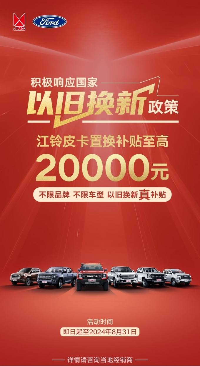 正所谓“政府搭台、企业唱戏、百姓受益”,为了让国家政策惠及更多用户,作为国内皮卡领域的领头羊,江铃皮卡迅速响应国家号召,紧密围绕《若干措施》中关于汽车以旧换新的补贴导向,精心策划并推出了极具力度购车优惠活动,不仅为用户慷慨送上至高20000元置换补贴,还巧妙融合多项购车福利,将政策红利直接送达每一位用户手中,引领汽车消费新风尚,加速市场消费升级步伐。