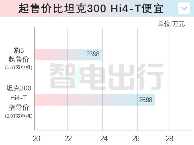 7月29日,比亚迪方程豹汽车宣布:硬派混动SUV豹5全系官降5万元,新售价区间为23.98万-30.28万元,起售价比长城坦克300 Hi4-T(2.0T+双电机)便宜。