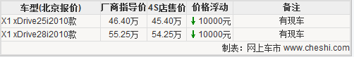 2010年1月20日,宝马正式推出旗下第四款X系列车型——X1,这款定位于紧凑型豪华SAV(Sports Activity Vehicle)的车型,不仅是X系列最小的一员,而且最低不到36万元的售价,无疑将宝马X系列车型的准入门槛拉低了一个级别。近日,笔者从北京宝马专营店处获悉,X1现车充足,购车可优惠1万元。具体请见下表:
