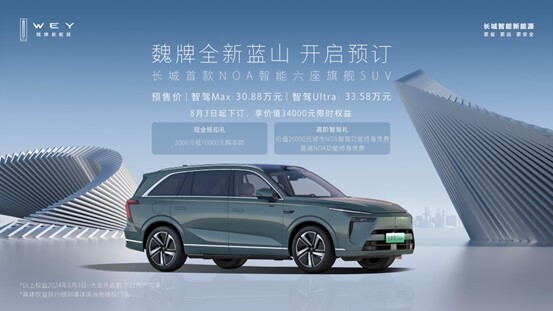 8月2日,在魏牌全新蓝山“智驾游深圳”NOA挑战直播活动中,长城汽车副总裁刘艳钊公布了魏牌全新蓝山的预订价格和限时权益。其中智驾Max 版预售价30.88万元,智驾Ultra版预售价 33.58万元,预订权益包括现金抵扣礼(2000元抵10000元购车款),高阶智驾礼(价值26000元城市NOA智驾功能终身免费,高速NOA功能终身免费)。8月3日零时起,用户即可在魏牌新能源官方APP、小程序等渠道下订。