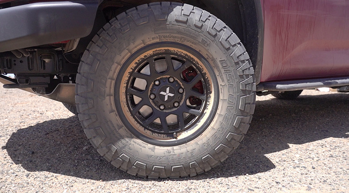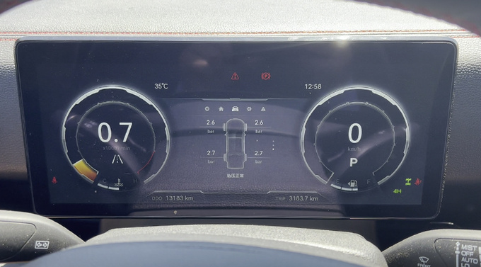 尖锐的石子不仅会冲击底盘,对于车轮的考验也十分巨大,并且当时地表温度已达到62.2℃,更是增加了爆胎风险。大道敢探者原厂配备尺寸为285/70 R17的AT3越野轮胎,大花纹设计和285的胎宽有效增加了轮胎接地面积,巨大咬边设计的胎肩同样带来了更好的非铺装路面抓地力。并且还针对胎侧进行了加厚设计,有效应对碎石路面冲击。再加上大道敢探者仪表内的胎压显示功能,时刻守护轮胎安全,不会出现因高温导致的爆胎情况。
