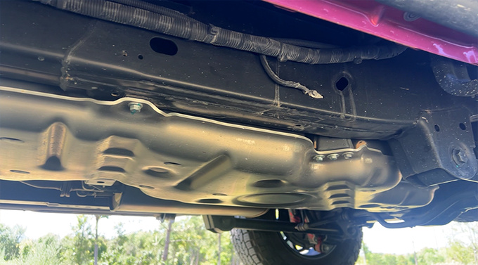 极热环境和恶劣路况对于车辆的底盘系统也是一大考验,碎石路段下车轮碾压过后的弹起的碎石无时无刻不在冲击着大道敢探者的底盘。不过大道敢探者的非承载式车身天生便具备更强的可靠性,并且它更是采用了行业首创的辊压成型方钢纵梁,纵梁截面高度可达183mm,并且原厂配备了底盘护板,足以应对大多数越野穿越路况。