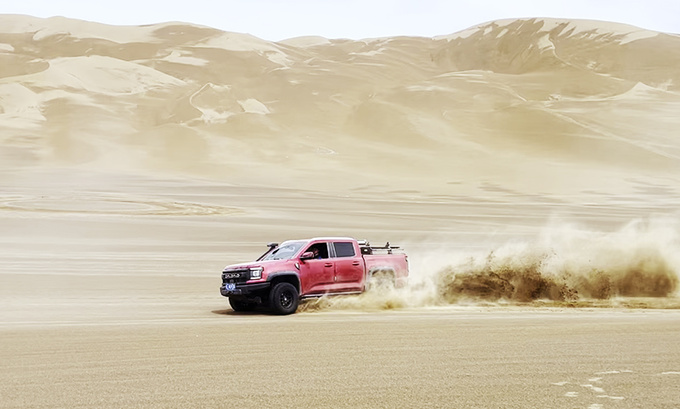 穿越过程中笔者大部分时间采用4H模式,切换之后可以实现动力的50:50分配,即使是速度较低难以形成撞风降温的情况下也全程未出现过热,展现出极强的高温耐受性。而在穿越沙漠路段时,为防止陷车需要时刻保持稳定的车速,分动箱同样持续稳定工作,避免了陷车问题。不过即使不慎陷车,将大道敢探者的四驱系统切换至4L模式后,可以将其扭矩放大2.48倍,能够做到安全脱困。