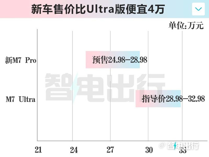 8月6日,问界新M7 Pro开启预订,共4款版型,预售价24.98万元-28.98万元,较Ultra版下调4万元,将于8月26日上市。问界新M7 Pro搭载HUAWEI ADS基础版,取消激光雷达硬件,但拥有主动安全、泊车、以及高速和城区快速路智驾能力;整车标配CDC连续可变阻尼减振器,驾乘更舒适。