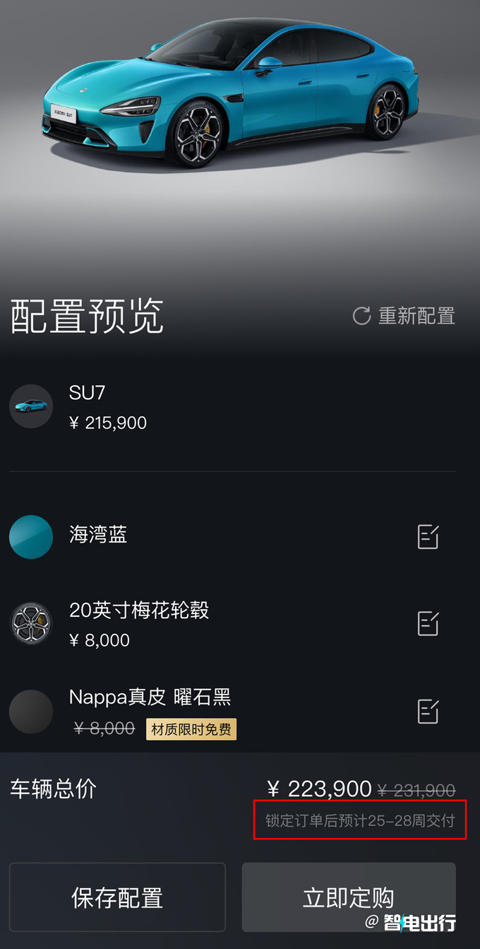 在配置选择中,每10个用户里,3个选择标准版,3个选择Pro版,还有4个选择Max版本。目前选择SU7低配车型,锁定订单后预计25-28周交付;购买顶配Max版本大约要等待28-31周左右。