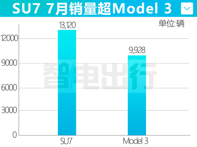 小米SU7以13,120辆的成绩超过特斯拉Model 3,登顶7月20万以上轿车销量榜!SU7在实现了43天交付破万后,仅用4个月的时间登顶细分市场榜首。