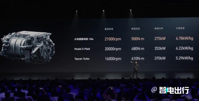 在三电高效方面,特斯拉在几年前就保持了领先地位。不过短短一年就被颠覆了。小米超级电机V6s最高转速、峰值扭矩、峰值功率和功率密度等指标均超过了特斯拉Model S Plaid和保时捷Taycan Turbo。