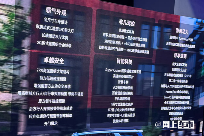 新车内饰配备高通8195芯片、HUD抬头显示、11英寸液晶仪表+17.7英寸中控屏、流媒体后视镜、BOSE10扬声器音响,并标配Super Cruise超级辅助驾驶系统。