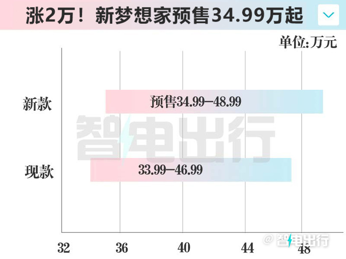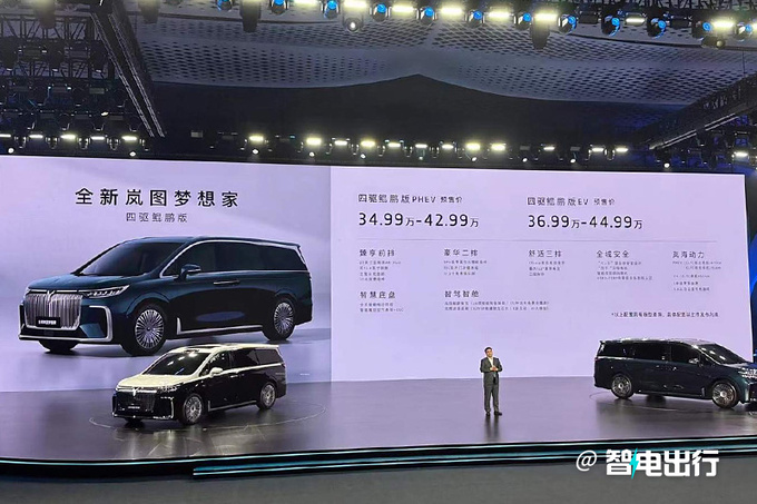8月28日,岚图新梦想家开启预售,四驱鲲鹏版PHEV预售价34.99万元-42.99万元,四驱鲲鹏版EV预售价36.99万元-44.99万元,起售价较2024款分别上调1万元和3万元。搭载乾崑ADS3.0高阶智驾和鸿蒙座舱的四驱乾崑版PHEV/EV版预售价分别为46.99万和48.99万。新梦想家对外观、座舱、智驾进行升级,搭载192线激光雷达。
