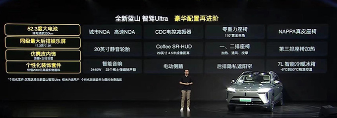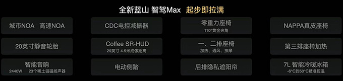 全新蓝山标配15.6英寸悬浮中控双联屏、第三代智能驾驶系统Coffee Pilot Ultra、Nappa真皮座椅、冷暖双用冰箱、副驾零重力座椅、电动侧踏、Coffe OS 3智慧空间系统、Coffee AI Sound、23个稀土强磁扬声器、流媒体后视镜、29英寸SR-HUD抬头显示等。智驾Ultra版较Max版增加了17.3英寸后排娱乐屏。
