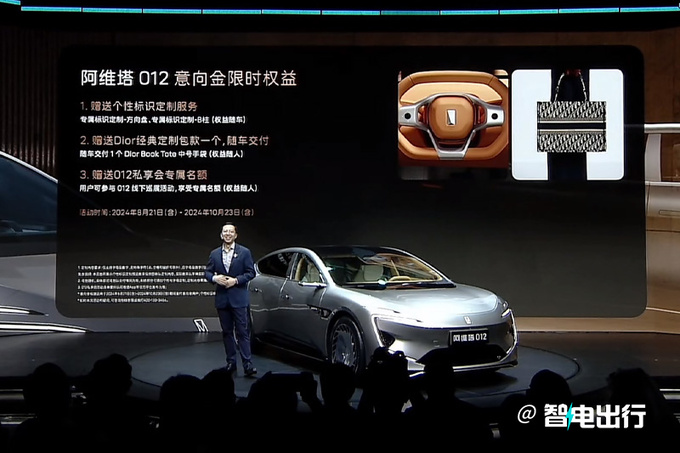 阿维塔012开启预售,售价70万元,全球限量700台。意向金限时权益赠送个性标识定制服务、Dior经典定制包款一个(随车交付)以及012私享会专属名额。