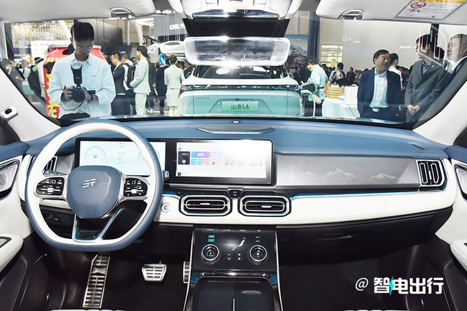 山海L7车内配备全液晶仪表+中控双联屏,搭载3幅多功能方向盘,出风口下方配备液晶屏幕+旋钮控制空调,中岛区域支持手机无线充电。