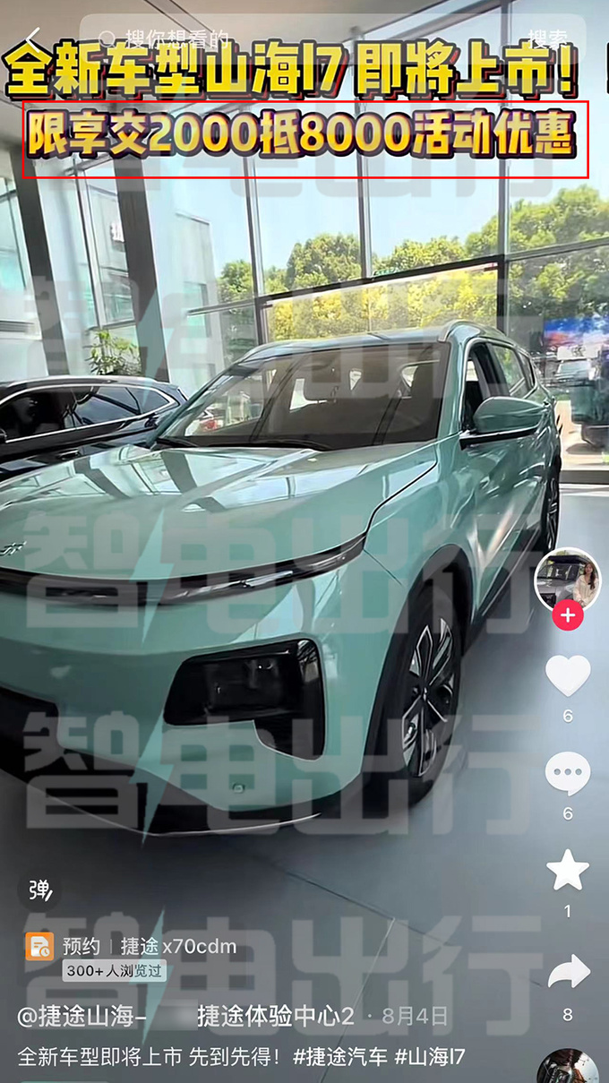 捷途山海L7将于8月30日成都车展开启预售。新车前脸与理想L7相似,尺寸除车长外与X70 C-DM一致。山海L7提供5座/7座可选,搭载奇瑞第五代1.5TGDI混动专用发动机+电机。某经销商表示,现在下订可享交2000元抵8000元购车款活动,相当于优惠6000元。