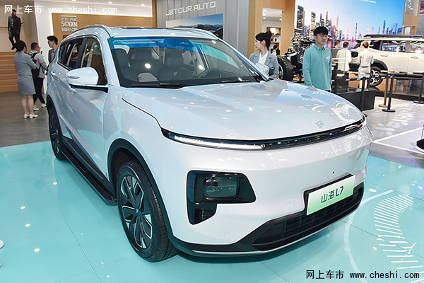 山海L7前格栅下方搭载梯形熏黑进气口,两侧分布方形大灯组,上方配备分体式LED日行灯,中间采用饰条营造贯穿效果。车侧轮眉及车门下方使用熏黑饰条装饰,尾部配备贯穿式尾灯,中部悬挂捷途品牌英文标识,车顶提供行李架。
