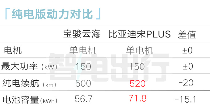云海纯电版单电机最大功率150kW,CLTC纯电续航分别为500km和600km;插混版搭载1.5L插电混动系统,发动机最大功率78kW,提供60km与140km两个版本,WLTC工况下亏电油耗4.96L/100km。