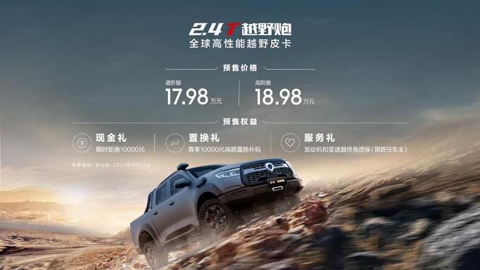 日前,长城炮倾力打造的品类创新力作“全球高性能越野皮卡”——2.4T越野炮正式开启预售。2.4T越野炮进阶版预售价17.98万元、高阶版预售价18.98万元,预订用户可尊享“现金礼、置换礼、服务礼” 三重大礼,诚意满满。2.4T越野炮还以够劲、够野、够安全的卓越产品性能,为2024长城炮杯虎克之路4X4极限越野挑战赛全力护航,并成功登顶有中国“狮子背”之称的虎克之路金刚坡,可谓是“出道即巅峰”。