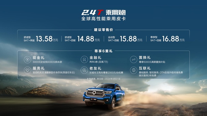 今年5月,2.4T乘用炮、2.4T商用炮联袂上市,车型凝聚长城皮卡造车底蕴,更强劲、更省油、更智能、更安全,强势引领皮卡品类价值跃升。2.4T乘用炮9AT柴油四驱舒适型自5月上市以来,收获用户广泛关注,订单火爆。近日,2.4T乘用炮全系车型全面上市,官方建议零售价13.58万-16.88万元。2.4乘用炮全系车型的全面上市,将进一步满足用户多元购车需求,助力长城炮销量提升。
