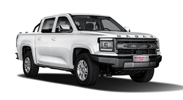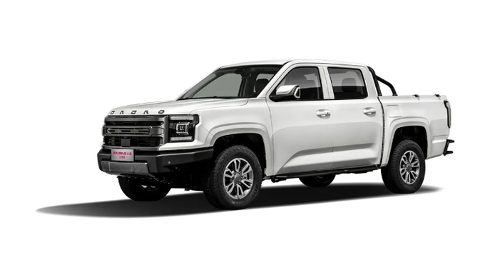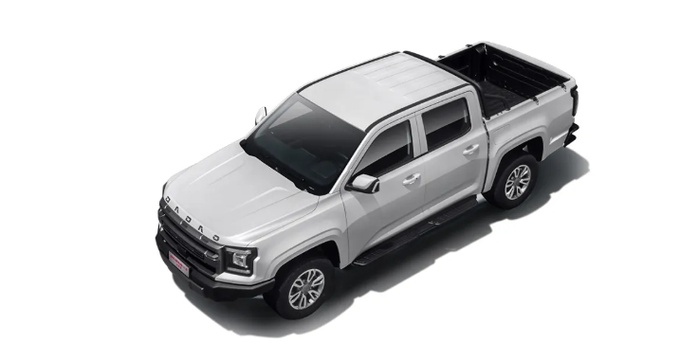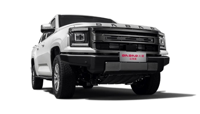 首先来看外观,大道山地版在大道皮卡的超高颜值基础上进一步优化升级,将车头logo改为纯字母“DADAO”,并且将其位置也从格栅正中移到了引擎盖上方,显得更具简洁美感和高端化气息。车头其他部分则基本延续了此前大道皮卡的设计语言,车身尺寸为5450/5685x1935x1872mm,轴距为3270/3470mm,属于中大型宽体皮卡,具备出色的视觉冲击力。