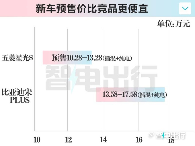 五菱星光S将于8月28日上市,提供5款版型(3款插混+2款纯电),预售价10.28万元-13.28万元。星光S轴距2.8米,比同级对手比亚迪宋PLUS更长,标配环抱式6安全气囊、LED大灯组、主驾6向电调座椅和双层流自动变频空调。纯电版全系提供510km续航、神炼电池2C,充电15分钟续航200km,综合电耗低至14kWh/100km。