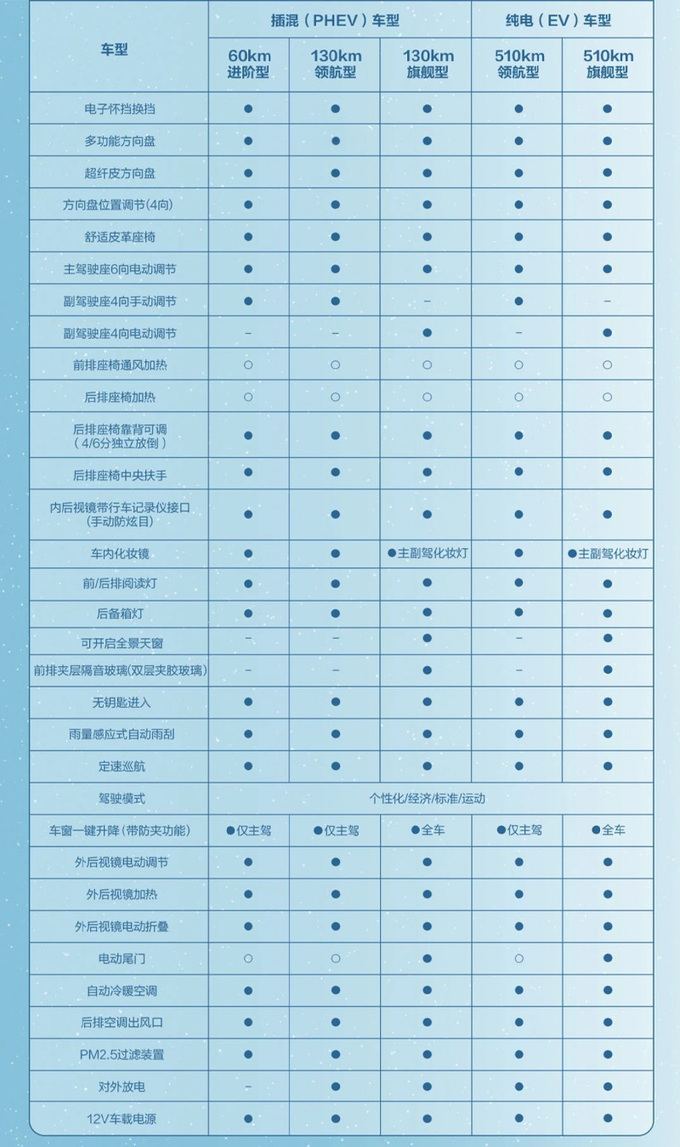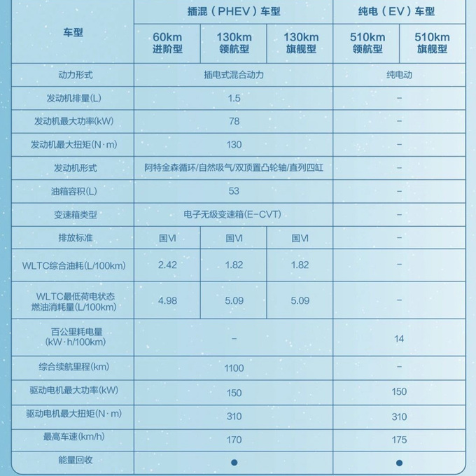 星光S采用前麦弗逊后E型多连杆独立悬架,后悬双层隔振设计,搭配18英寸轮毂。纯电版搭载150kW的电机,峰值扭矩310N·m,匹配60kWh电池组,10%-80%补电耗时20分钟。插混版搭载1.5L发动机,发动机最大功率78kW,电机功率与纯电版一致,匹配9.5/20.5kWh磷酸铁锂电池,CLTC纯电续航里程分别为60km和130km。
