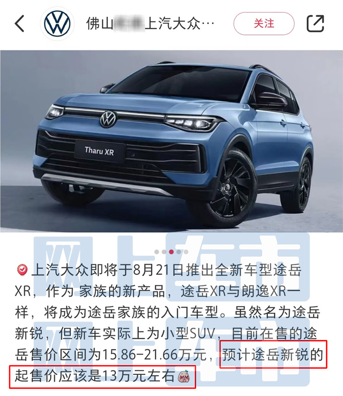 上汽大众宣布:途岳新锐将在8月30日成都车展上市。新车尺寸介于途铠与途岳之间,搭载1.5L、1.5T发动机,百公里油耗5.7L。某经销商表示,预计途岳新锐的起售价在13万元左右。新车未来将竞争本田XR-V、比亚迪元UP等。