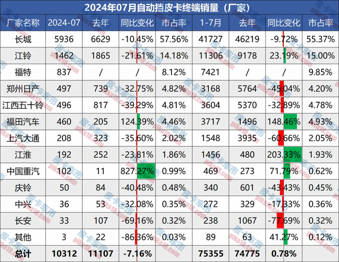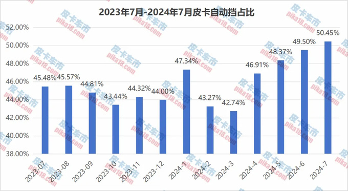 历史性一刻!在国内皮卡约40年发展史上,第一次自动挡皮卡的月销量超过了手动挡皮卡的月销量!7月自动挡皮卡的销量达到了10312辆,而本月手动挡皮卡的销量则为10127辆,自动挡皮卡占比达到50.45%。1-7月,自动挡皮卡的累计销量达到了75355辆,实现同比增长0.78%。而今年1-7月手动挡皮卡的累计销量则为83227辆,去年1-7月则达到了119253辆,同比下滑达到了30.21%!