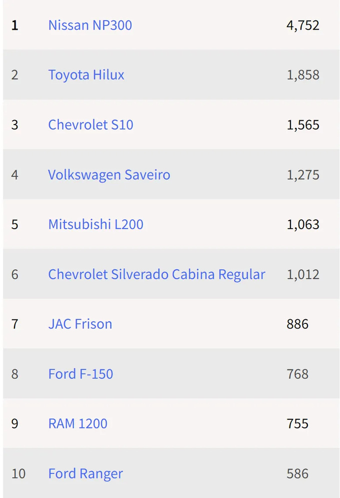 第一名仍然是日产NP300,也就是日产Navara,在美国叫日产Frontier。日产NP300本月销量为4752辆,表现非常稳定。在它之下,其他皮卡品牌月销量瞬间就掉到了2千辆以下。