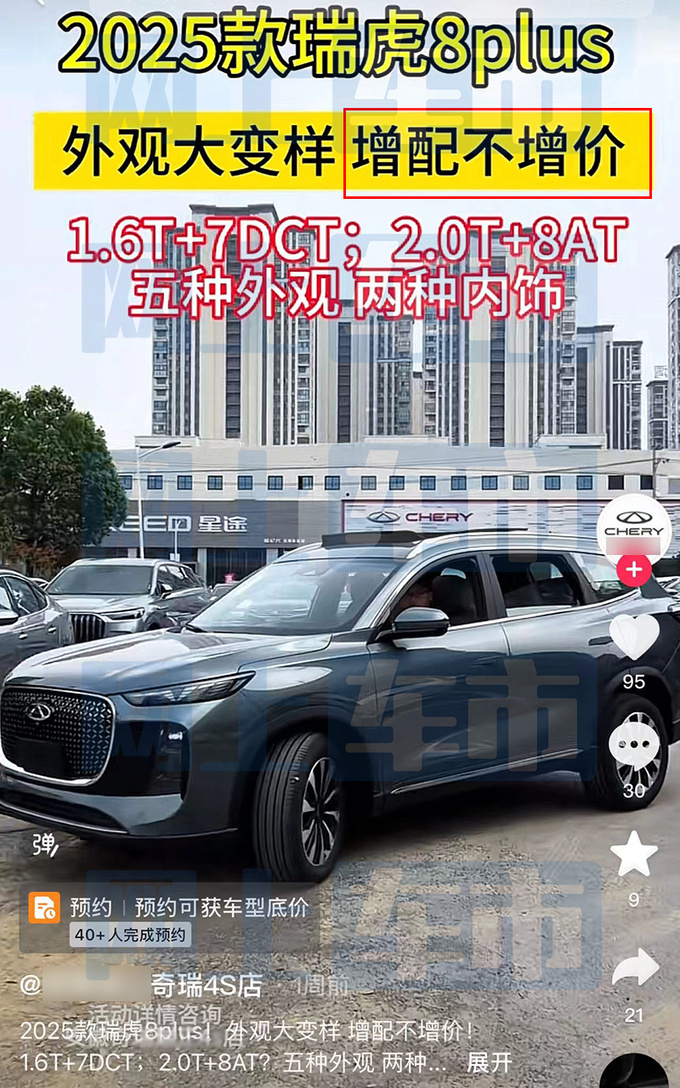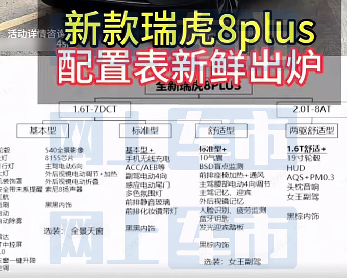 奇瑞官方宣布,新款瑞虎8 PLUS将于9月10日上市。新车已经到店,部分配置提前曝光:标配高通骁龙8155车机芯片,提供黑色、黑/粽内饰色,分为1.6T+7DCT和2.0T+8AT两种动力。某4S店销售表示:新瑞虎8 PLUS增配不增价(现款指导价12.69万-14.59万元)。