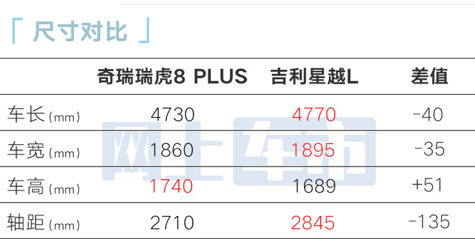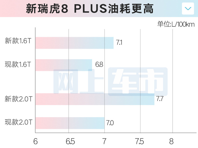 新瑞虎8 PLUS 1.6T和2.0T发动机,最大功率分别为145kW、187kW,峰值扭矩分别为290N·m、390N·m,综合油耗分别为7.1L/100km、7.7L/100km,较现款增加0.3L/100km、0.7L/100km。
