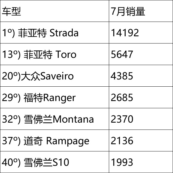 最后是皮卡车型在巴西市场非常受欢迎。今年7月份的销量冠军依然是菲亚特Strada皮卡,其销量为14192辆。