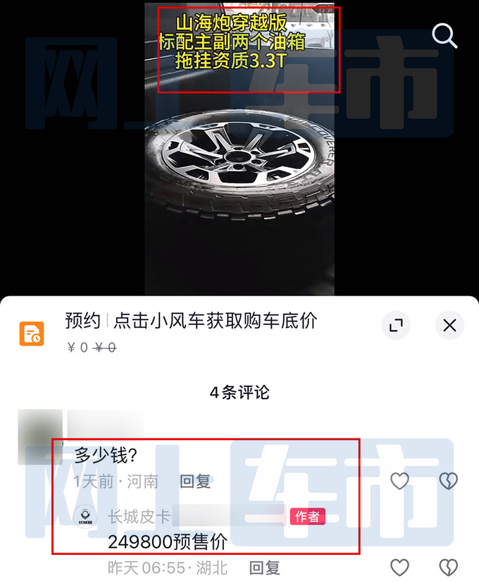 长城皮卡山海炮穿越版将于8月30日成都车展开启预售,新车基于坦克平台打造,是唯一原厂标配双油箱的皮卡。某经销商销售透露,山海炮穿越版预售价为24.98万元,比乘用版柴油车型起售价贵2.1万元。