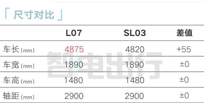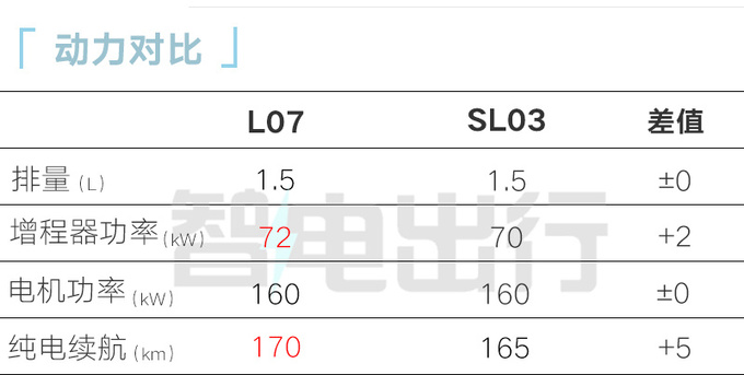 L07提供增程与纯电双动力,增程版搭载1.5L增程器,最大功率72kW,比SL03高2kW,驱动电机峰值功率160kW,匹配28.39kWh磷酸铁锂电池,馈电油耗4.7L/100km;纯电版搭载185kW的单电机。