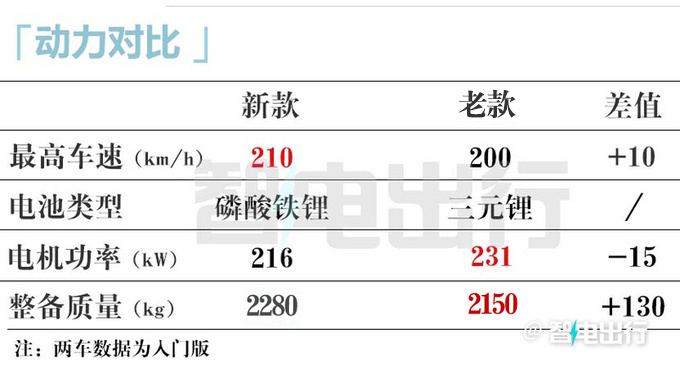 四驱版前后电机分别为200kW、379kW,最高车速252km/h,与老款一致,整备质量比老款轻了22kg,为2410kg。