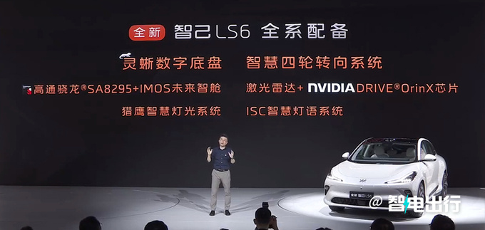 新车还全系配备高通骁龙®SA8295+IMOS未来智舱、猎鹰智慧灯光系统、激光雷达+nVIDIADRIVE@OrinX芯片、ISC智慧灯语系统。