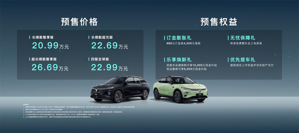 8月30日,岚图旗下高端纯电SUV岚图知音在2024成都车展上正式开启预售,新车共公布4个版本,预售价格区间为20.99-26.69万元。同时,岚图知音还特别推出4重好礼:订金膨胀礼,985元订金可抵扣4000元尾款;无忧保障礼,终身免费整车及三电质保;乐享焕新礼,以岚图本品增换购可享10000元现金补贴,他品置换可享5000元现金补贴;优先提车礼,让用户提前锁定上市权益并优先排产交付。