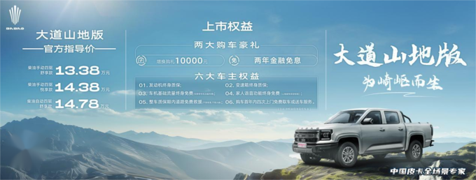 自2023年3月品牌成立以来,江铃大道陆续推出了大道全能者、大道追光者、大道敢探者等多款深受用户青睐的车型,并于今年接连带来了大道极寒版、大道山地版等细分品类化车型,在满足用户全场景出行需求的基础上,持续夯实着“中国皮卡全场景专家”的品牌定位。同时,江铃大道还以“同道中人”为用户构建了专属阵地,满足着用户探索生活,奔赴热爱的情绪价值。面向未来,江铃大道将以用户出行需求与情绪价值的双向满足,持续深化品类战略与服务,为用户创造更加丰富多彩的皮卡生活体验。