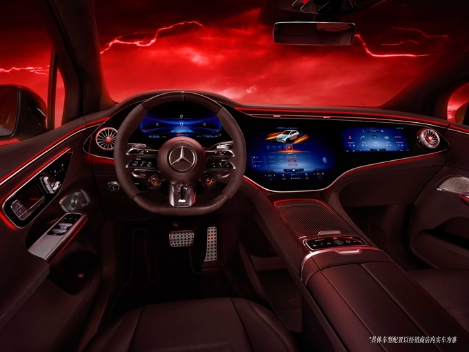 全新AMG EQE 53纯电SUV的先锋车身设计,令每一个线条,都是风与力的直接对话。AMG垂瀑式封闭格栅还原了AMG源自赛道的标志性设计,飒烈气场,骁然乍现;与之无缝相连的智能数字大灯可投射AMG专属“律动光幕”投影,一眼之间便可点燃驾驶欲望。经过空气动力学优化的22英寸轮毂搭配红色卡钳,与遍布车身的AMG夜色组件相得益彰,令先锋姿态倍添动感。以一整块1.41米超大曲面玻璃覆盖的MBUX超联屏,提供AMG专属显示风格,搭配主动式环境氛围灯,将驾驶的愉悦以光影实时呈现。